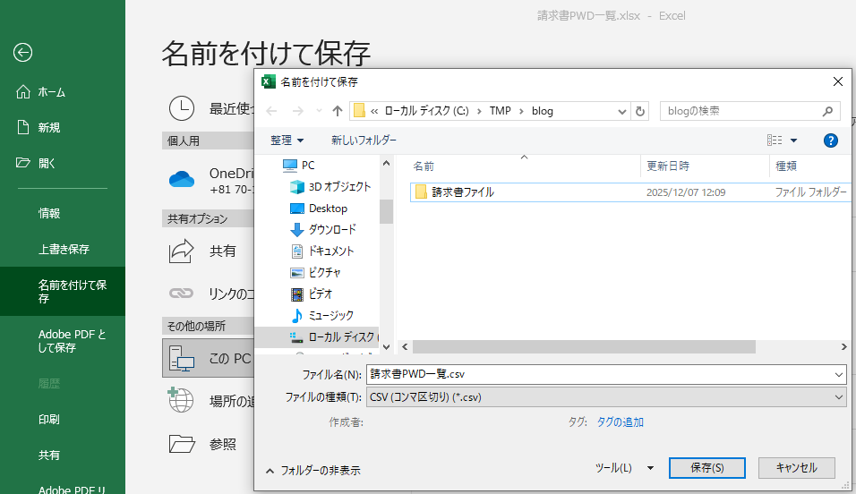 ここでは「請求書PWD一覧.csv」というファイル名で保存しています。