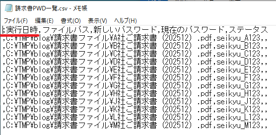 4. Excelを終了し保存されたファルダから「請求書PWD一覧.csv」をメモ帳で開いてみましょう。