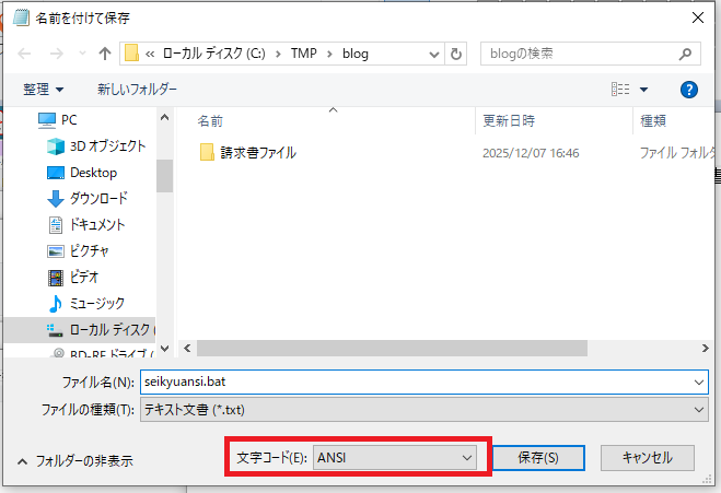 保存の際に注意事項があります。ファイル名に日本語が使われている場合は文字コードを「ANSI」モードで保存しましょう。